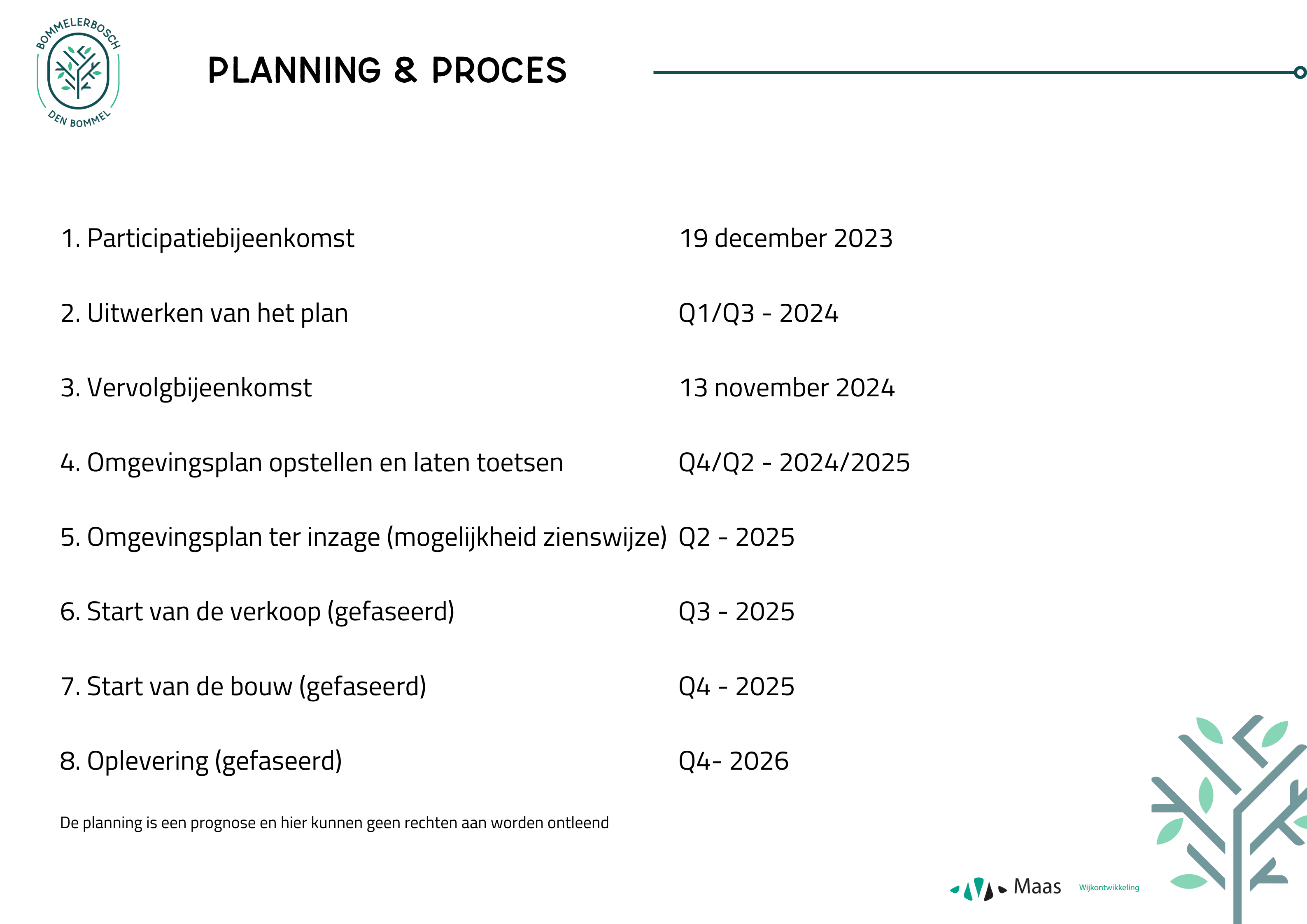 Het vervolg op het stedenbouwkundige plan is het opstellen van een beeldkwaliteitsplan. De Landschapsarchitect en de Architect zijn hier druk mee bezig. Daarnaast lopen er diverse onderzoeken voor het Omgevingsplan. Indien alles vervolgens volgens planning verloopt, verwachten we in de eerste helft van 2026 te kunnen starten met de verkoop van de woningen.
